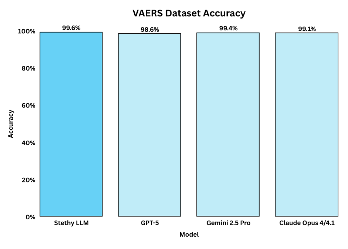 On the VAERS dataset, all models perform at a high level, but Sentinel still distinguishes itself with 99.6% accuracy, placing it above GPT-5 (98.6%) and Claude Opus 4/4.1 (99.1%), and Gemini 2.5 Pro (99.4%). Therefore, while commercial models are strong on structured benchmark data, Stethy delivers the same (or better) performance, while being specifically designed to address the unique demands of healthcare and patient safety.